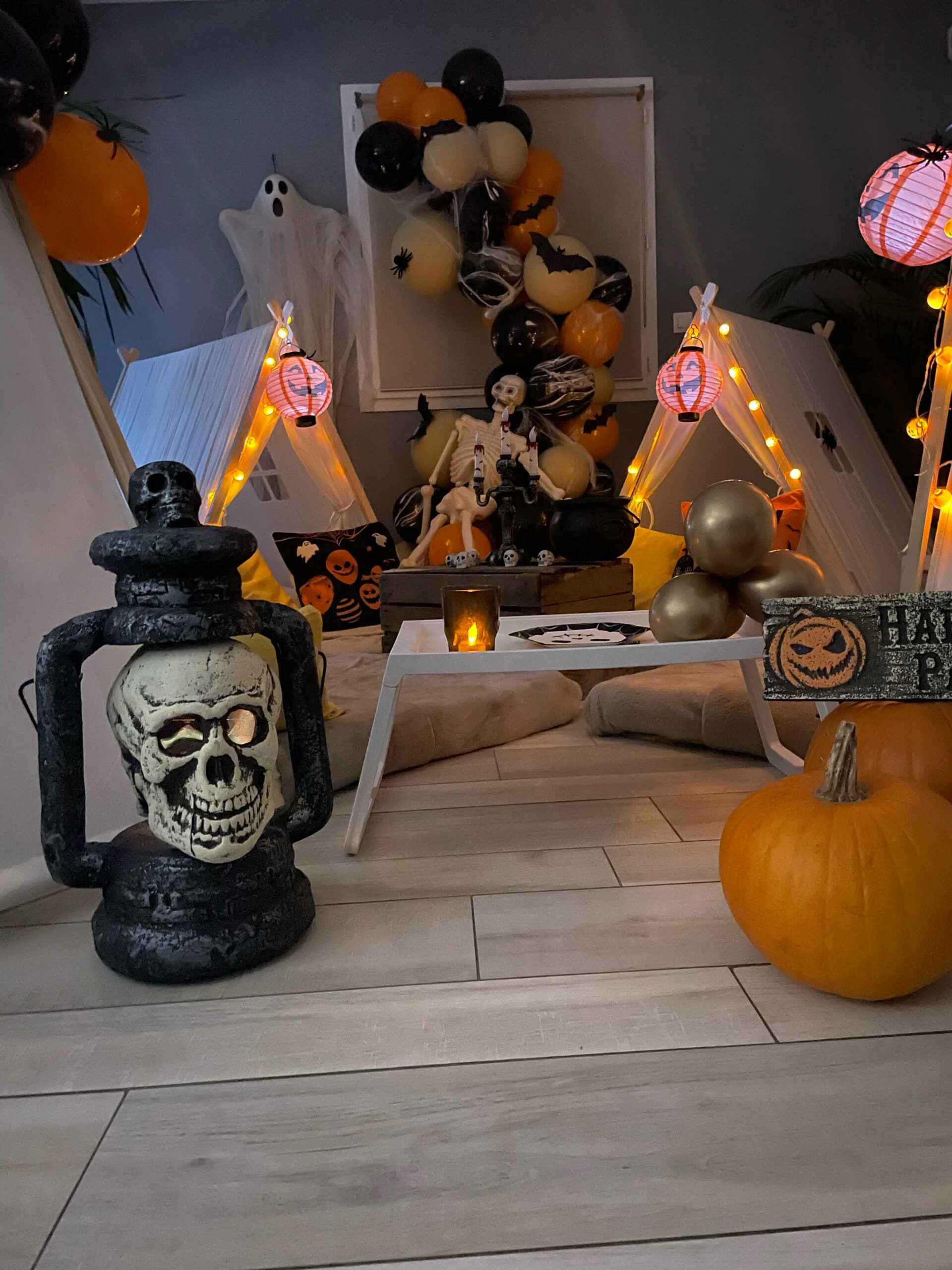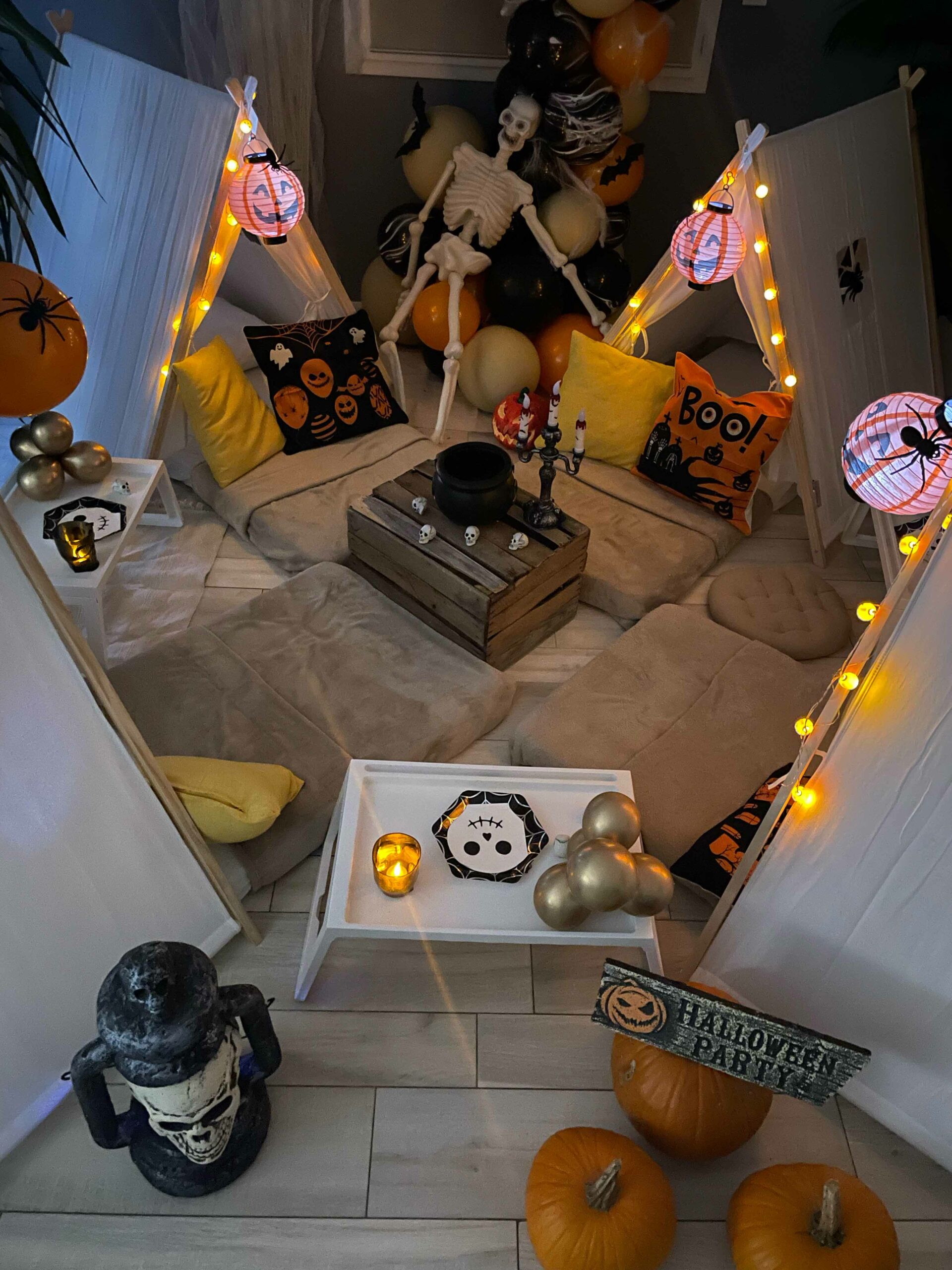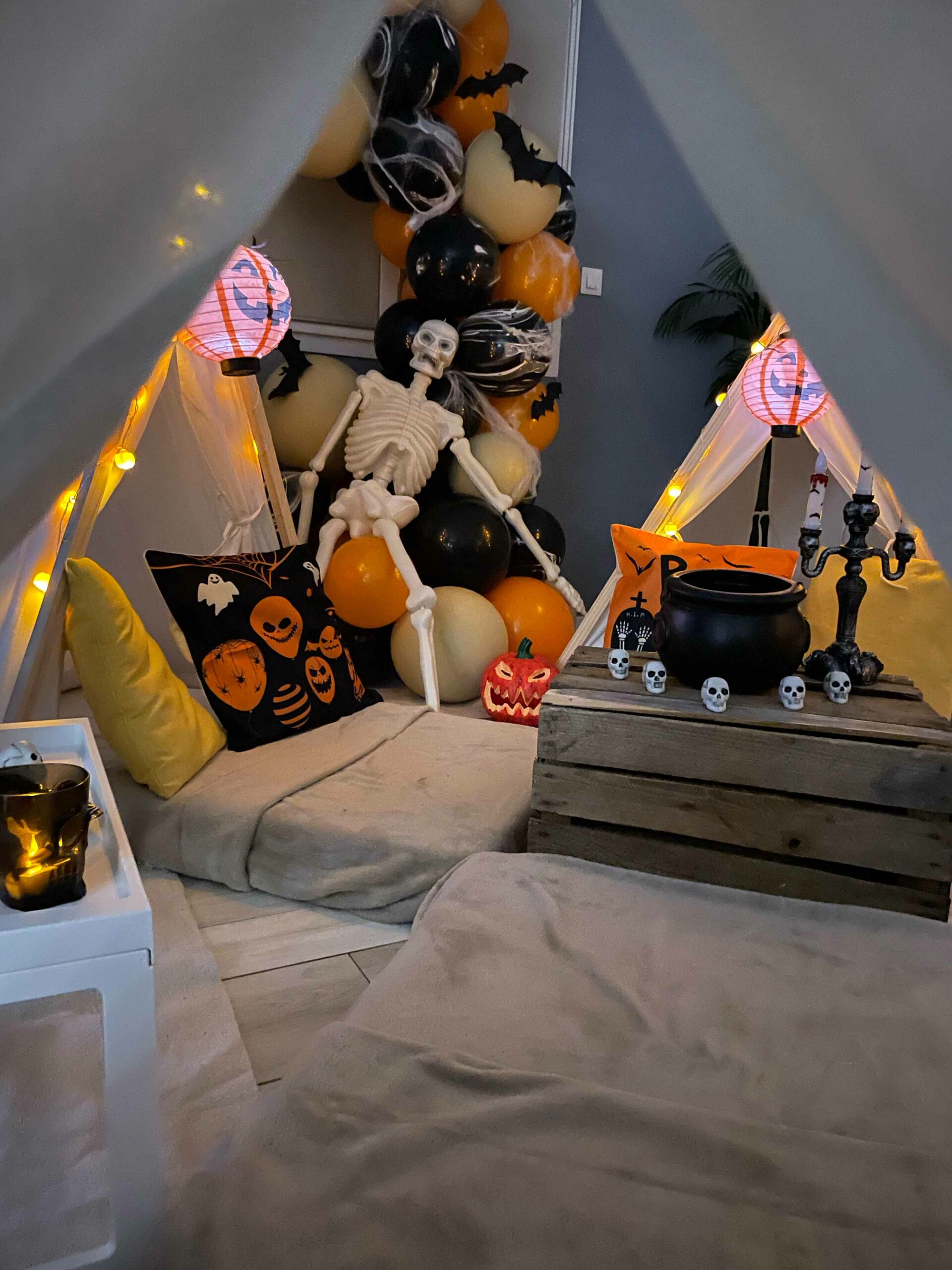 Pour cette Halloween Party, l’ambiance était aussi effrayante qu’amusante ! Le salon s’est transformé en repaire mystérieux, parfait pour une soirée pyjama sous le signe de la citrouille, des fantômes et des squelettes farceurs. Les tipis étaient illuminés de guirlandes orange et garnis de coussins aux motifs d’Halloween, créant un cocon chaleureux malgré les toiles d’araignées suspendues un peu partout…