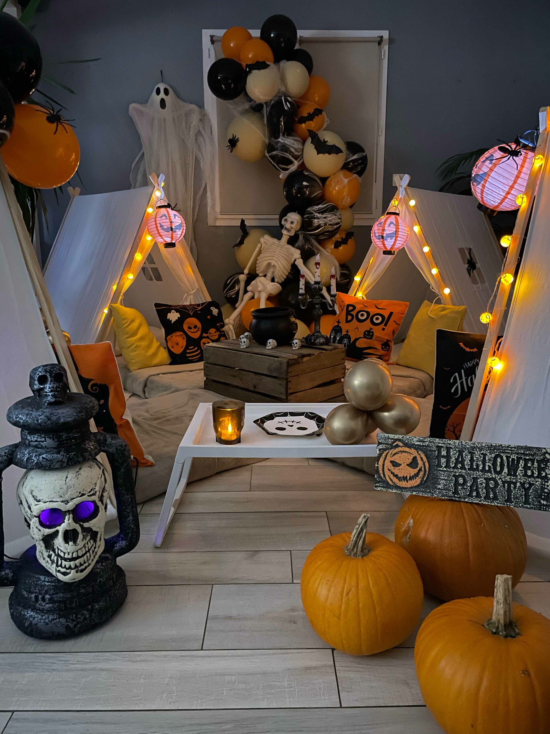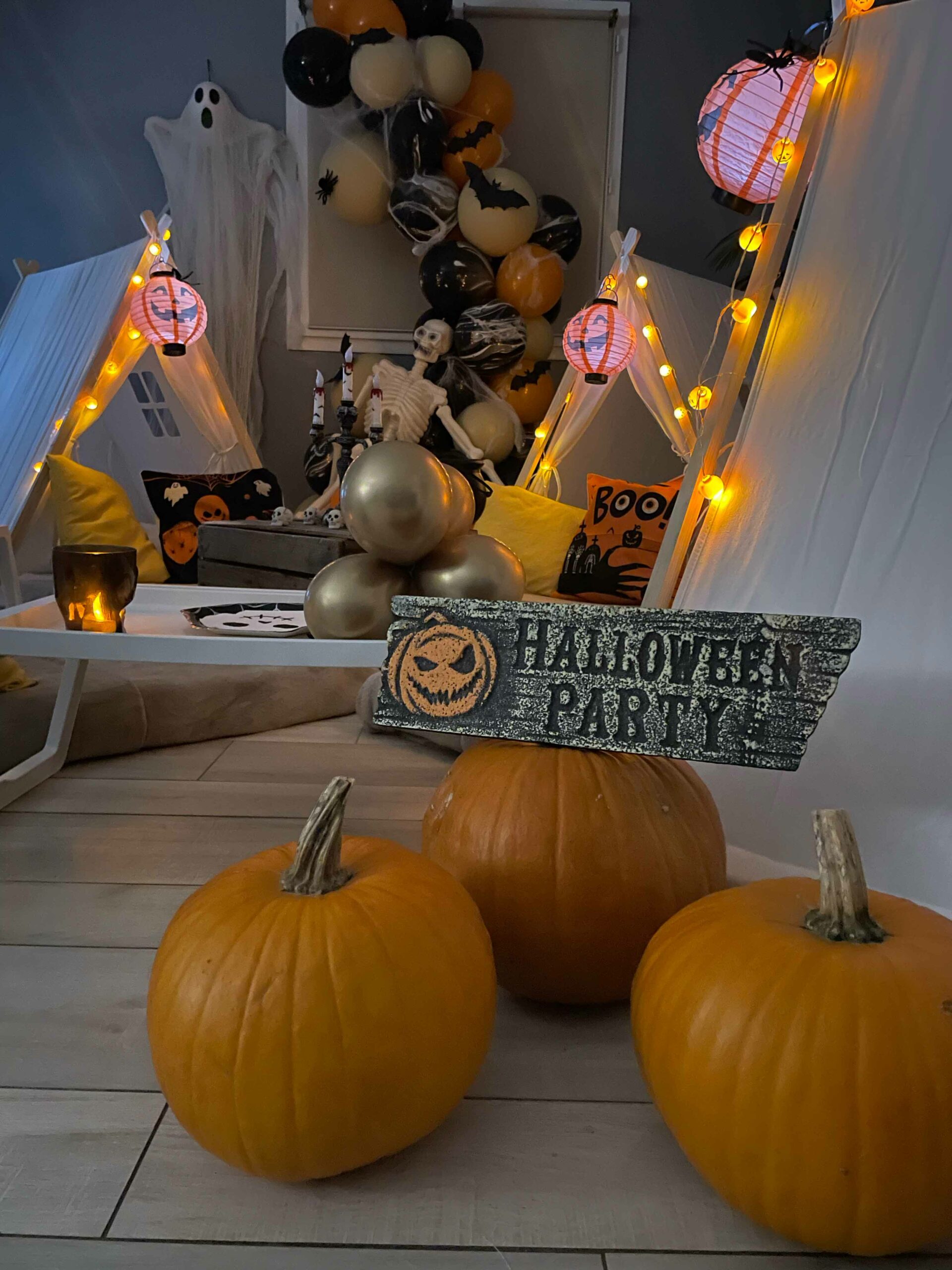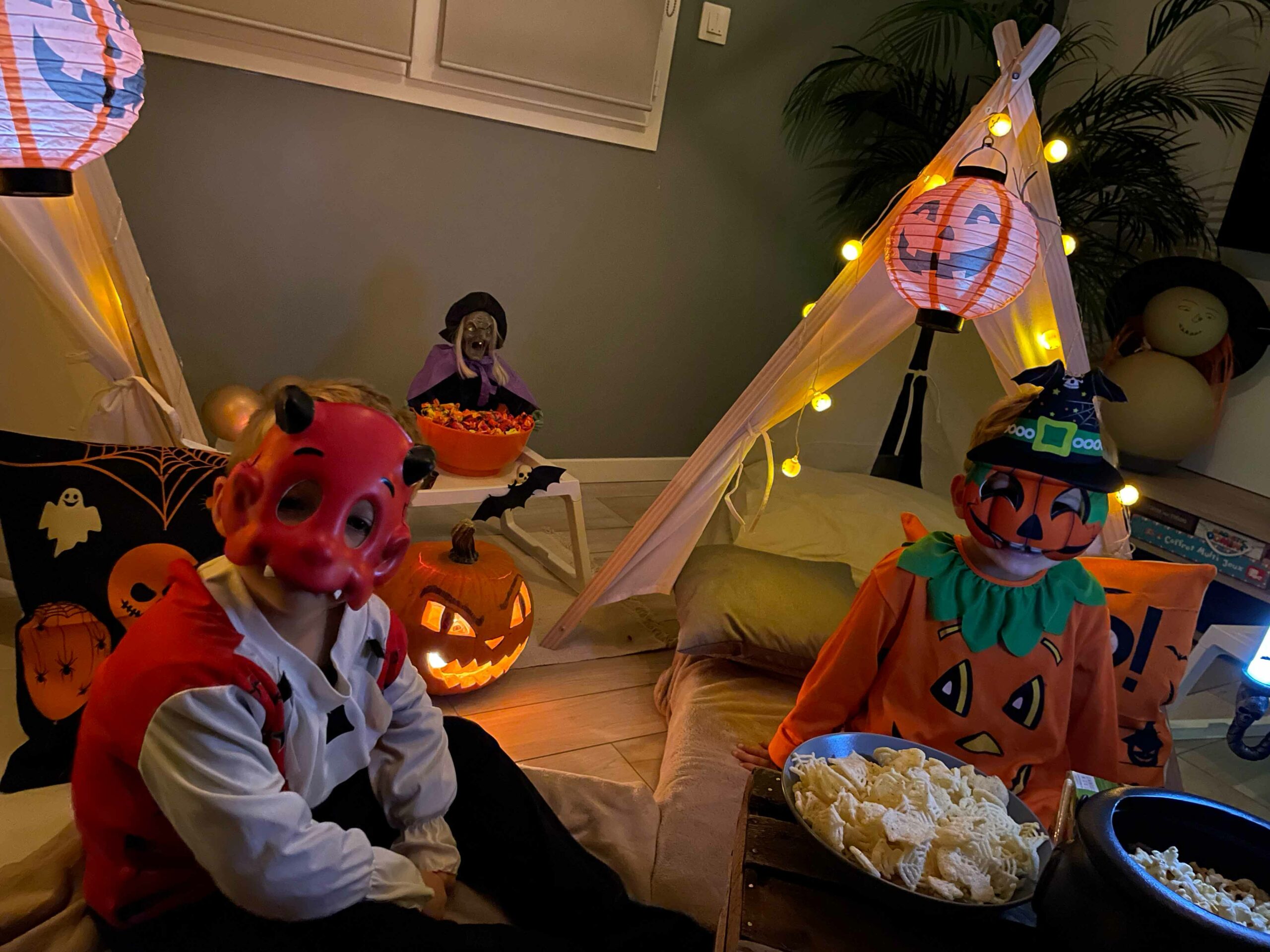 Pour cette Halloween Party, l’ambiance était aussi effrayante qu’amusante ! Le salon s’est transformé en repaire mystérieux, parfait pour une soirée pyjama sous le signe de la citrouille, des fantômes et des squelettes farceurs. Les tipis étaient illuminés de guirlandes orange et garnis de coussins aux motifs d’Halloween, créant un cocon chaleureux malgré les toiles d’araignées suspendues un peu partout…
