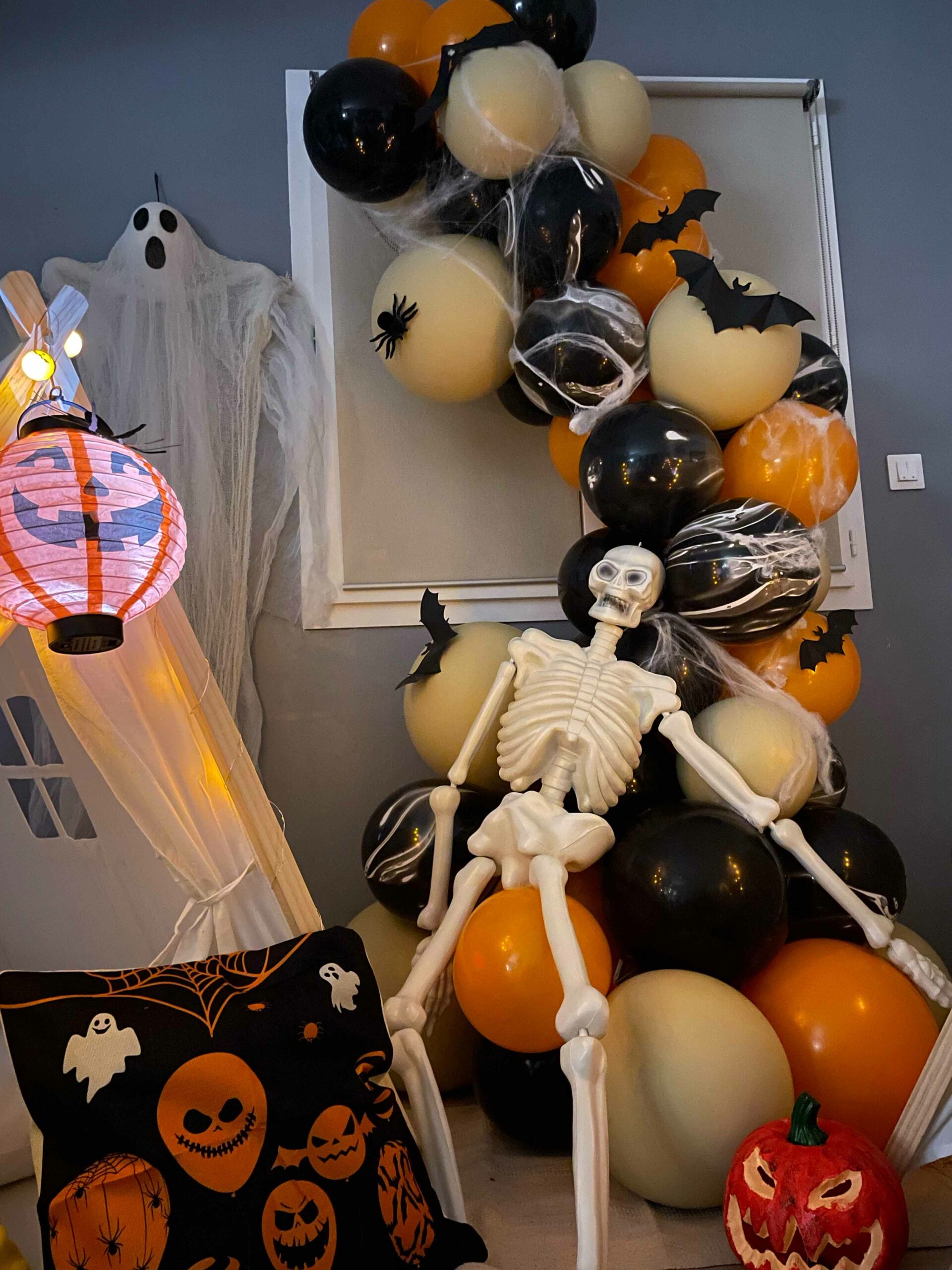 Un squelette rigolo accueillait les invités dans une mise en scène terriblement fun, avec un chaudron prêt à mijoter des potions magiques, un chandelier gothique, et une arche de ballons noir, orange et crème, décorée de chauves-souris et toiles fantomatiques. Les citrouilles étaient bien sûr de la fête, posées en évidence pour renforcer cette atmosphère délicieusement macabre.